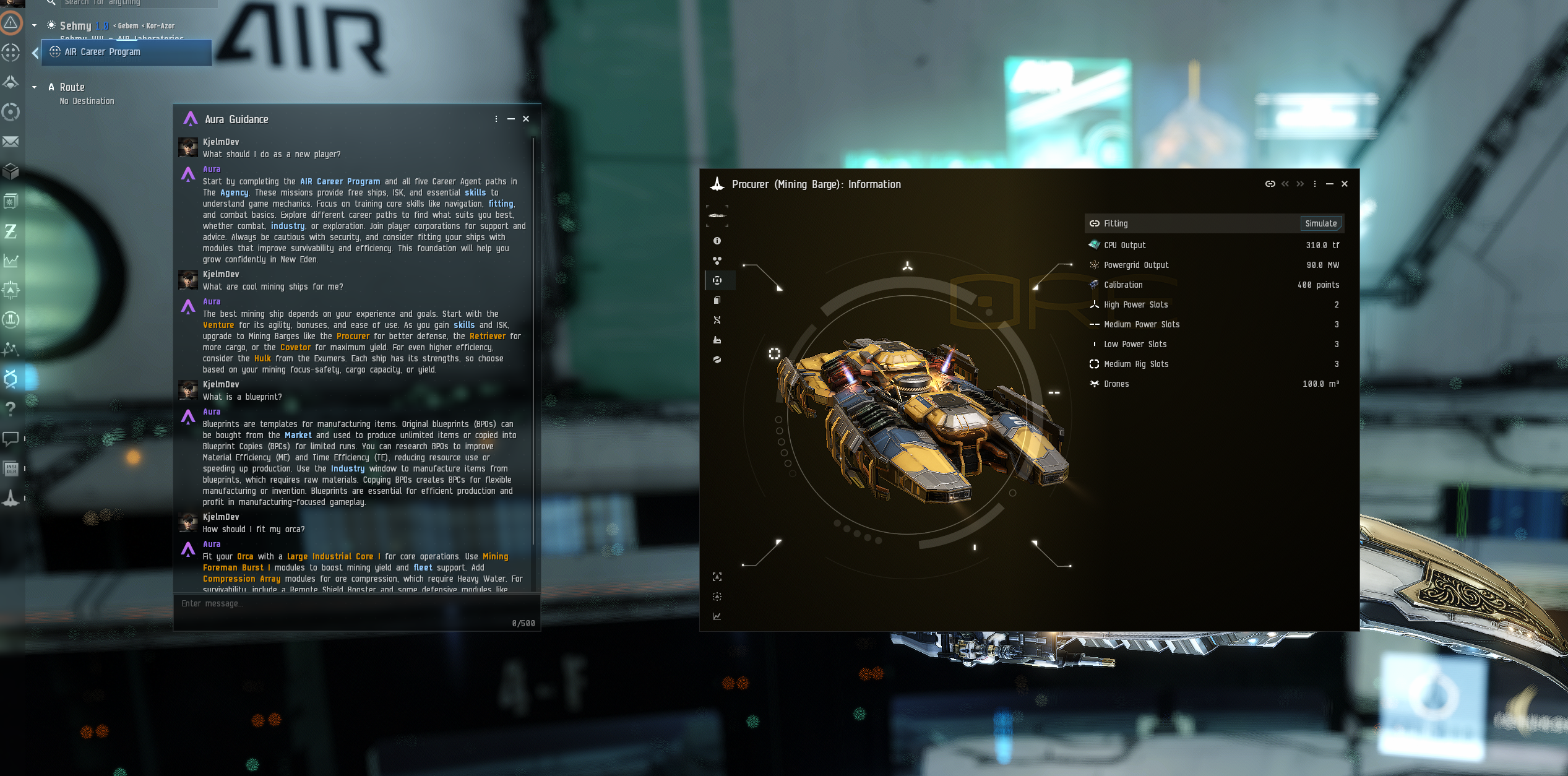 • Aura Guidance is an in-development chat tool designed to help new pilots find their footing without reliance on external resources. It is currently a prototype and will be iterated on over time as CCP Games collects data on how players use it. The results will determine what to keep, what to discard, what to improve, and where to go next.